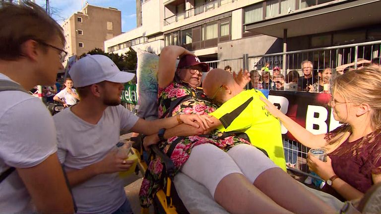 Net voorbij de finish ziet Bianca zondagmiddag de lopers van de halve marathon aan zich voorbij trekken. Ze ligt op een speciale brancard. Dat kan dankzij de Wensambulance. "Het is heel stil thuis nu, dus ik moet een beetje wennen aan de herrie." Maar het is een mooie dag voor Bianca: "Ja, ik vind het heel leuk. Lekker in het zonnetje!" Twee zoons en een dochter van het stel beleven de bijzondere middag met hun ouders mee. Ook zij vinden het mooi wat er gebeurt. "Ja, geweldig natuurlijk".