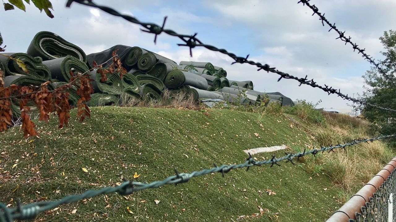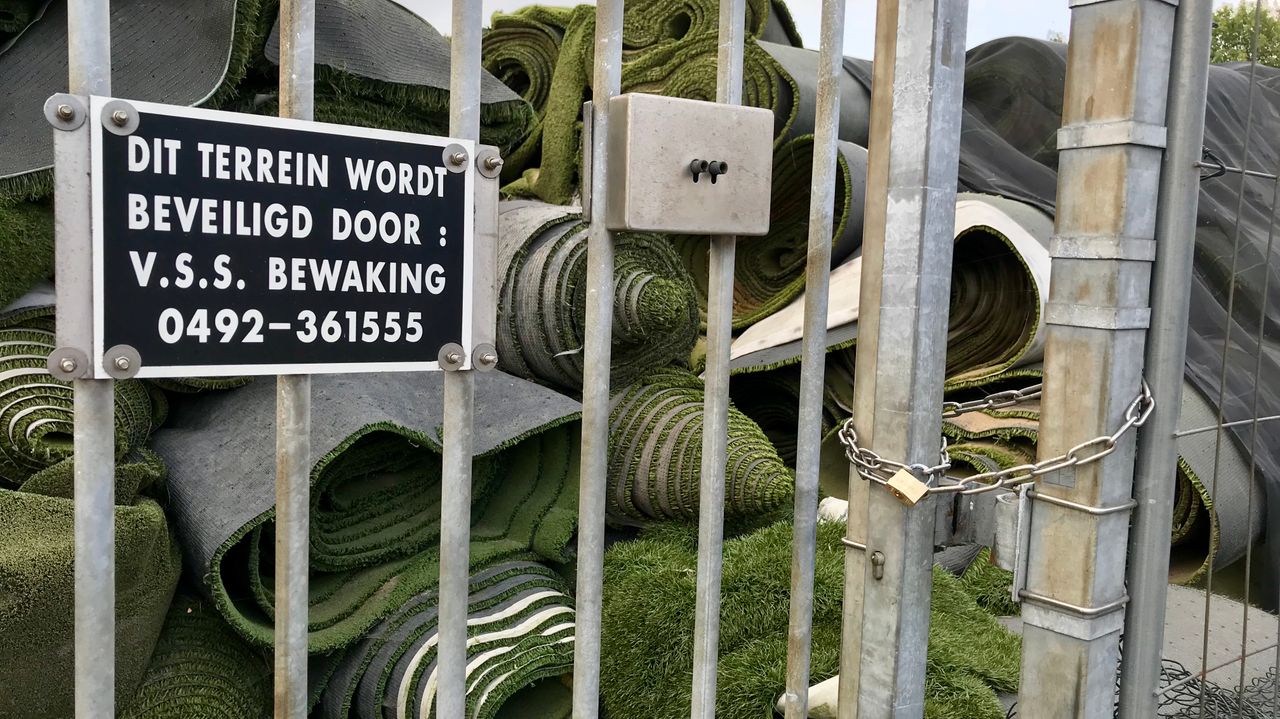 Heel weinig. Alle poorten van het bedrijf zijn afgesloten met een slot. Ook loopt er een beveiliger rond die ervoor moet zorgen dat niemand het terrein betreedt. Er worden dus nu geen kunstgrasmatten gerecycled of aan- en afgevoerd.