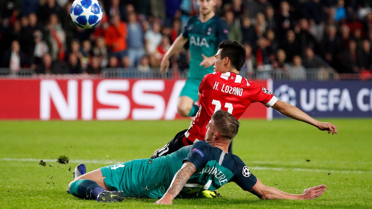 '30 DOELPUNT PSV! Toby Alderweireld krijgt de bal van Davison Sanchez terwijl hij de laatste man op de helft van Tottenham Hotspur is. Hij wordt opgejaagd door Hirving Lozano en verspeelt de bal. De Mexicaan snelt richting het doel van Hugo Lloris. Alderweireld knokt zich terug en blokt het schot van Lozano. Via de benen van de Belg vliegt de bal in het doel: 1-0.