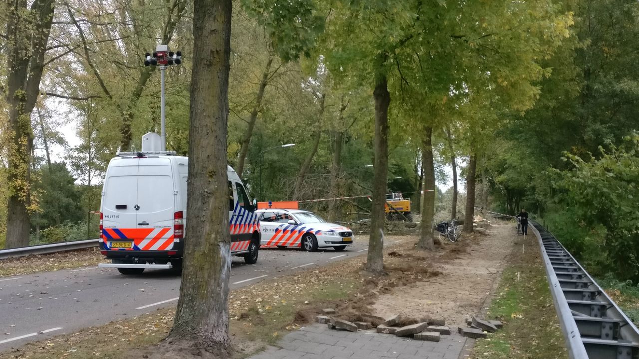 De tegels op beide fietspaden worden vervangen voor een laag asfalt. Daarom werden maandag de bomen gerooid. De weg was afgezet met lint en verkeersregelaars regelden in beide richtingen het verkeer.