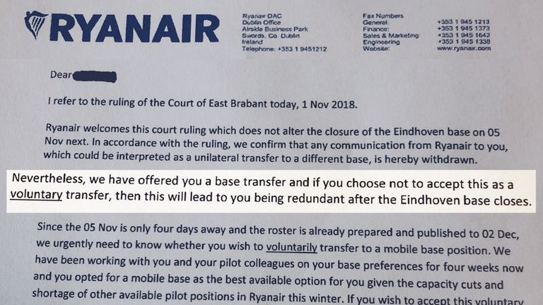 Volgens de VNV ontvingen de piloten na het vonnis van de rechter een brief van Ryanair waarin ze voor een keuze worden gesteld: vrijwillig kiezen voor overplaatsing een zogenaamde ‘voluntary transfer’ of een ontslagprocedure, een ‘redundancy process’. De brief is volgens de Vereniging Nederlandse Verkeersvliegers opnieuw het bewijs dat Ryanair lak heeft aan een rechterlijke uitspraak in Nederland. Geen enkele piloot zou volgens de VNV op het 'aanbod' van Ryanair in zijn gegaan.