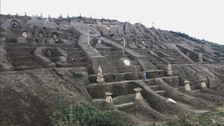 Met slechts een schep en een troffel is het huizenhoge werk gemaakt. Dat het deels van klei is, is zowel een vloek als een zegen. "Zeker met het warme weer was het behoorlijk zwaar", bekent Aldenhoven. "Maar door de klei is het niet na een regenbui verdwenen." Toch treedt snel erosie op. "Dat hoort erbij, ik ben ook niet meer zo knap als vroeger. Wij zijn ook vergankelijk."