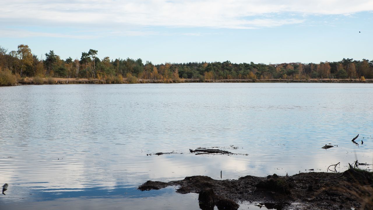 Op het eerste gezicht zie je gewoon een goed gevuld ven, maar door de droogte staat het water toch zo'n tien tot twintig centimeter lager dan voorgaande jaren. Normaal op dit tijdstip van het jaar staat het water op 11,6 meter, zegt boswachter Janneke de Groot.