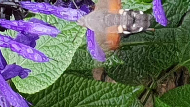 Op de wazige foto die ik kreeg van Clazien Wagtmans kan ik toch heel duidelijk een kolibrievlinder ontdekken. Ik snap dat het fotograferen van zo’n vliegensvlugge kolibrievlinder niet gemakkelijk is. Kolibrievlinders zijn eigenlijk nachtvlinders, maar ze zijn ook dagactief. Ze komen als trekvlinders ieder voorjaar vanuit Zuid-Europa naar Nederland en na voortplanting trekken de meeste vlinders in het najaar weer terug naar het zuiden. Kolibrievlinders gedragen zich exact hetzelfde als kolibries. Ze hangen snel vleugelklappend in de lucht stil voor bloemen en met hun lange roltong zuigen ze de nectar op. Overigens lijkt ook die lange roltong een beetje op de kromme snavel van de kolibrie vogel.