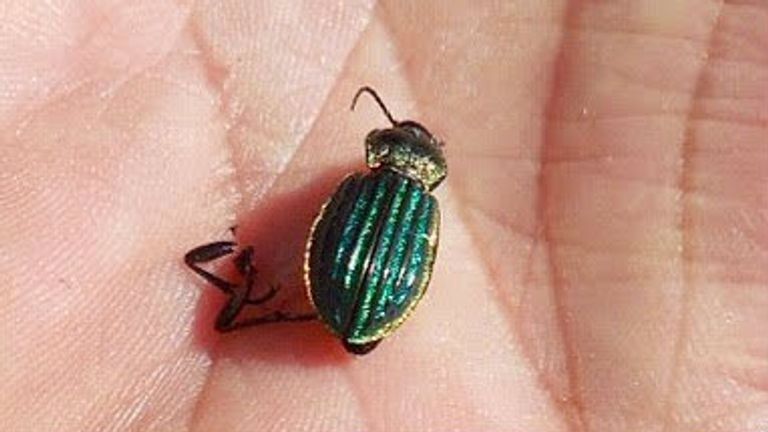 Op de hand van Hans van Veen zie je nog wat restanten van een kever, maar het is wel een bijzondere. In principe komt deze kever, de gouden schalebijter, voor in de kleigebieden. Toch kunnen we hem hier tegenwoordig ook tegenkomen, want zo langzamerhand verspreidt deze kever zich ook in andere delen van ons land. De gouden schalebijter heeft zijn naam vooral te danken aan de gouden randen aan zijn dekvleugels. Op het menu van deze kever staan slakken, regenwormen en insectenlarven. Het is een echte rover - uit de familie van loopkevers - en deze is vermoedelijk zijn meerdere tegengekomen... Als ik mag gokken is dat dan een zandloopkever geweest.