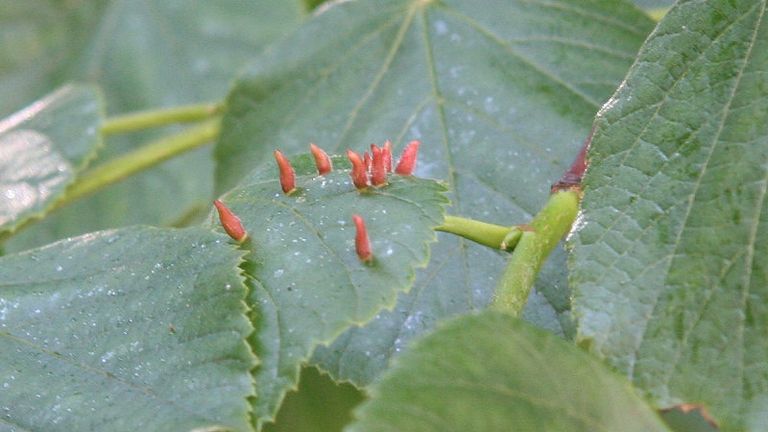 De familie Sens stelt een vraag over bladeren met steeltjes. Dit zijn altijd wat lastige vragen als je niet gezien hebt hoe die bladeren met steeltjes er echt uitzien, maar mijn eerste gedachte gaat uit naar een gal. In dat geval heb je verschillende soorten die dit veroorzaken bij lindebomen, namelijk galmuggen en galmijten. Aangezien de familie Sens het over een soort steeltjes heeft, denk ik aan een galmijt, die je kan zien op de foto. Galmijten hebben enkel gallen op de bladeren staan, maar doen verder niets. De gaatjes waar de familie Sens het verder over heeft, hebben dus niets met die galmijten te maken. Die worden veroorzaakt door een andere soort, vermoedelijk om een lindebladwesp. “Door een stevige bemesting met een kalkrijke meststof kan de bladconditie verbeterd worden waardoor minder vervroegd bladval op zal treden”, adviseert een vriend van mij. Wellicht helpt het, maar je kunt ook gaan kijken op de website van Ecostyle.