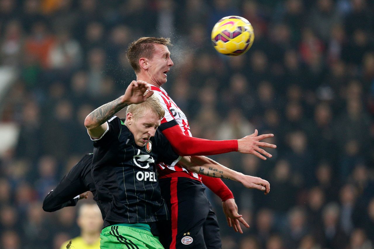 In zijn eerste treffen met de Rotterdammers als PSV'er - in het seizoen 2014/15 - maakte de spits drie doelpunten (4-3 zege). Dat waren meteen ook zijn laatste goals tegen Feyenoord. In tien daaropvolgende ontmoetingen bleef De Jong telkens droog staan.