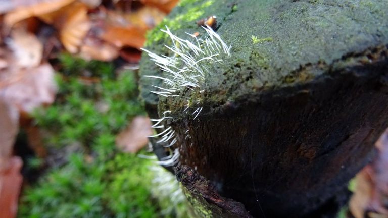 Op de foto die ik kreeg van Loes Westgeest zie je vanuit een boomstam enkele witte draden uitsteken. Zelf heb ik dit ook nog nooit gezien, maar ik vermoedde dat dit iets met schimmels of paddenstoelen te maken had. Daarom heb ik collega Bart Horvers gemaild. “Dit is een luchtmycelium", laat hij weten. "Dus niet toe te kennen aan een soort.“ Op internet vond ik iets interessants over zo'n luchtmycelium: zodra het voedsel in de bodem of in een substraat opraakt, wordt zo'n luchtmycelium gevormd. Dit ziet er wit en donzig uit. Het luchtmycelium vormt sporen die beter bestand zijn tegen de verslechterde omstandigheden en kunnen na verspreiding weer ontkiemen op plekken waar voldoende voedsel is.