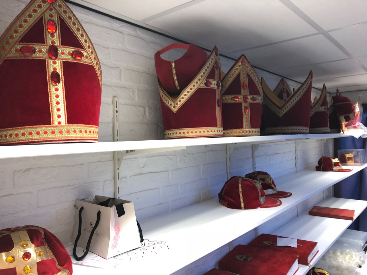 "De hulpsinten hebben hun eigen kleedkamer, met ieder hun eigen plekje op de plank voor de mijter en de werk-mijter." Navraag bij een hulpsint wijst uit dat dat een mooie baseballpet is, rood met gouden kruis erop, die de goedheiligman kan dragen in de auto. De mijter is dan te hoog. In totaal liggen er tien stuks klaar.