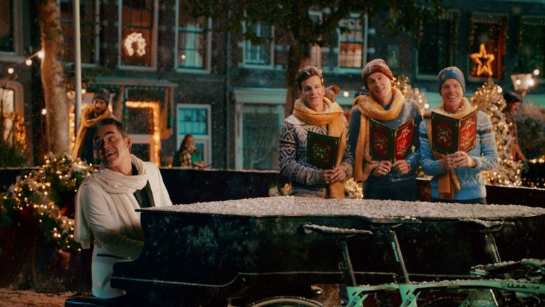 Aan de vele kersttruien te zien, moet het flink koud geweest zijn tijdens de opnames van de spot. Maar in dit geval moet het de symboliek zijn van ‘samenzijn’.