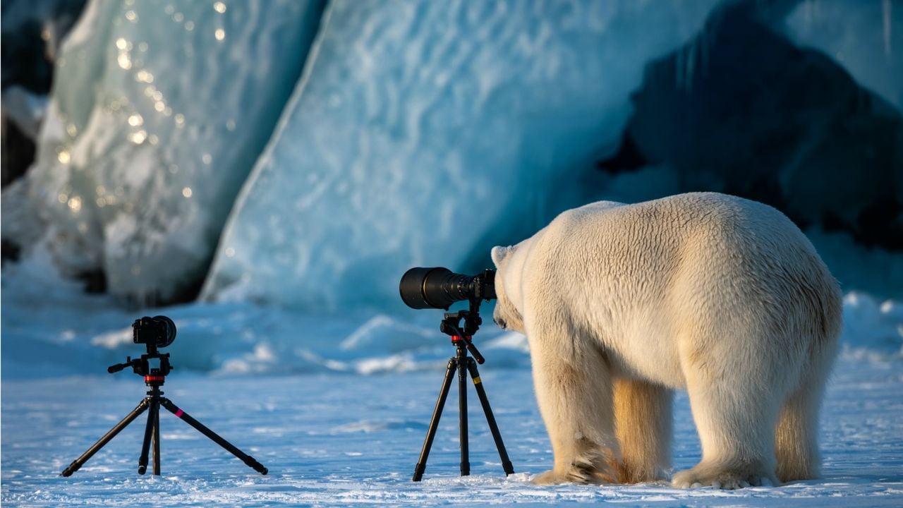 Bij deze foto valt ook van alles te bedenken. Het lijkt er een beetje op dat deze ijsbeer zojuist twee fotografen heeft verzwolgen en vervolgens als een wat onwennige oude heer een blik door de camera werpt. Het advies om bij ijsberen uit de buurt te blijven, is in ieder geval niet opgevolgd.