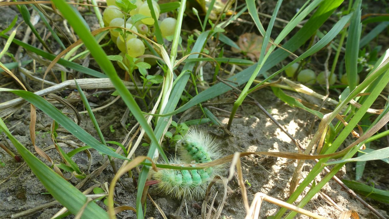 Op de foto die Carla van Bergen instuurde, zie onder de druiven een mooie geelharige rups met aan de achterkant iets dat op een rode speer lijkt. We hebben hier te maken met de rups van de meriansborstel rups. Deze rups is vernoemd naar de bekende vlinder- en insectenschilderes Maria Sibylla Meriam. Deze van oorsprong Duitse vrouw leefde van 1647 tot 1717 en woonde de laatste dagen van haar leven in Amsterdam. Zij was naast kunstenares en ook entomoloog. Vermoedelijk vanwege de opvallende borstels op de rug van de rups is deze naar haar vernoemd. Je vindt deze rups voornamelijk op sleedoorns, meidoorns, zomereiken, berken en gecultiveerde fruitbomen. De wijnranken op deze foto passen dus mooi in dit rijtje. Verder voeg ik de foto van de vlinder toe , waarin de rups na verpopping verandert.