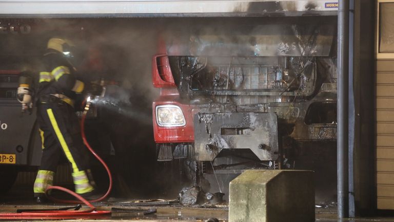 In de loods waar het vuur woedde, staan meerdere vrachtwagens. Drie zijn door de brand beschadigd, één is zwaar beschadigd aan de voorkant. De loods zelf vatte geen vlam. Bij de brand kwam veel rook vrij.