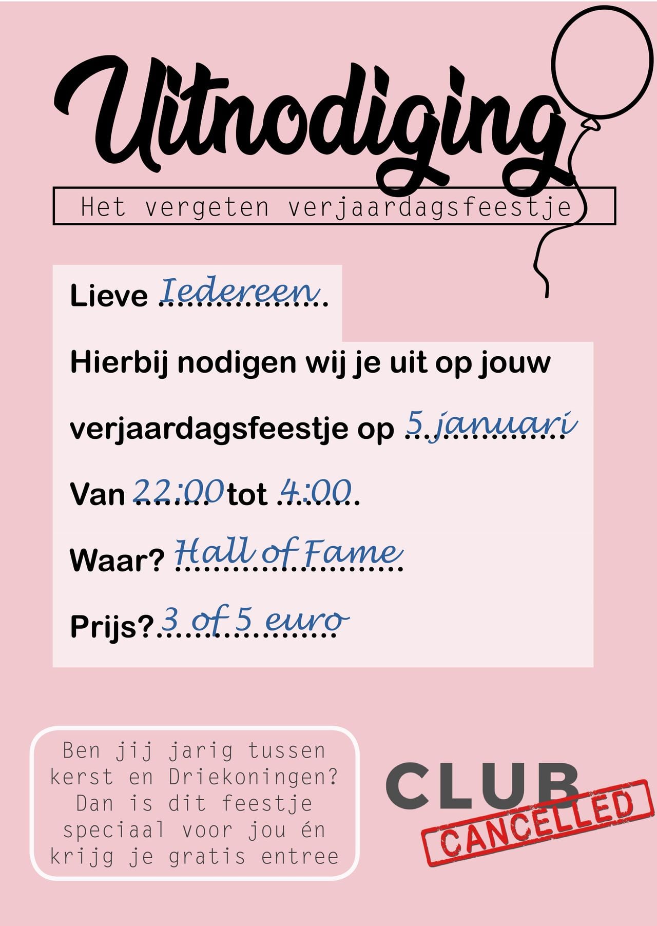 Op vijf januari viert Club Cancelled voortaan alle 'vergeten' verjaardagen. Ben je jarig tussen kerst en Driekoningen? Dan mag je zelfs gratis naar binnen. Het feest voor mensen die jarig zijn op een onhandige datum wordt gevierd in de Hall of Fame.
