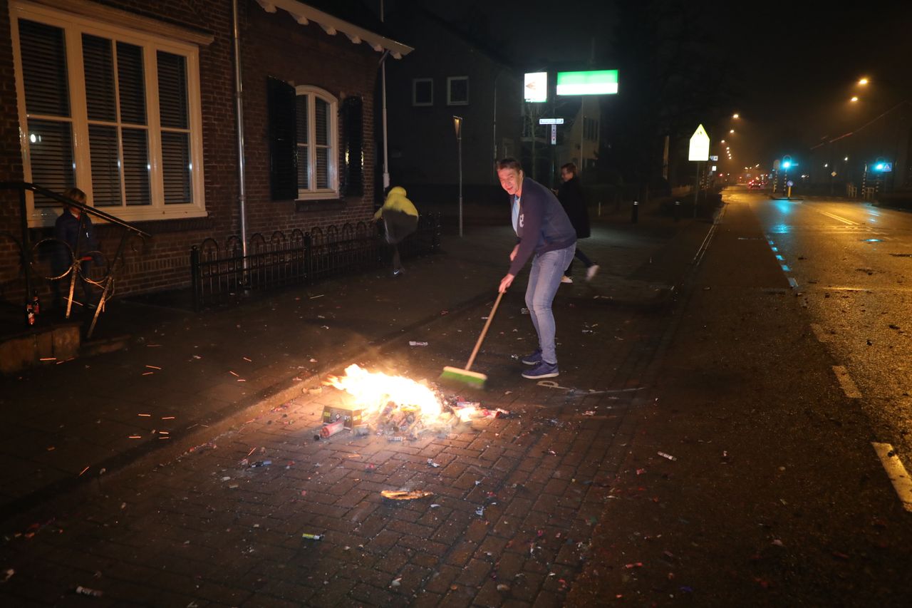 En als al het vuurwerk dan op is, ook de kleine rotjes, is het zaak de boel netjes op te vegen zodat er de volgende dag geen ongelukken mee kunnen gebeuren.