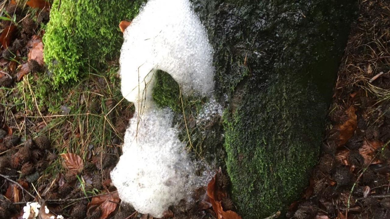 Op de foto die ik kreeg van Jeanne Brekelmans zie je aan de onderkant van een boomstam allemaal wit schuim. Dit fenomeen ontstaat in periodes met nachtvorst na een lange regenperiode. De nachtvorst en de regen zorgen er samen voor dat er spleten in de boom ontstaan. Hierdoor ontsnappen boomsappen, die in combinatie met de regen gaan gisten. Daarnaast zitten er op de boomstammen stoffen - eencellige boomalgen - die de bomen beschermen tegen insecten, bacteriën en schimmels. Deze boomalgen - ofwel saponinen - zorgen voor het schuim bij die gisting. Bij regen druipt het regenwater, vermengd met de eiwitten uit die boomalgen, langs de boomstam naar beneden. Hoe ruwer de schors, hoe meer saponinen dus. Bij eiken zie dit fenomeen nu heel vaak.