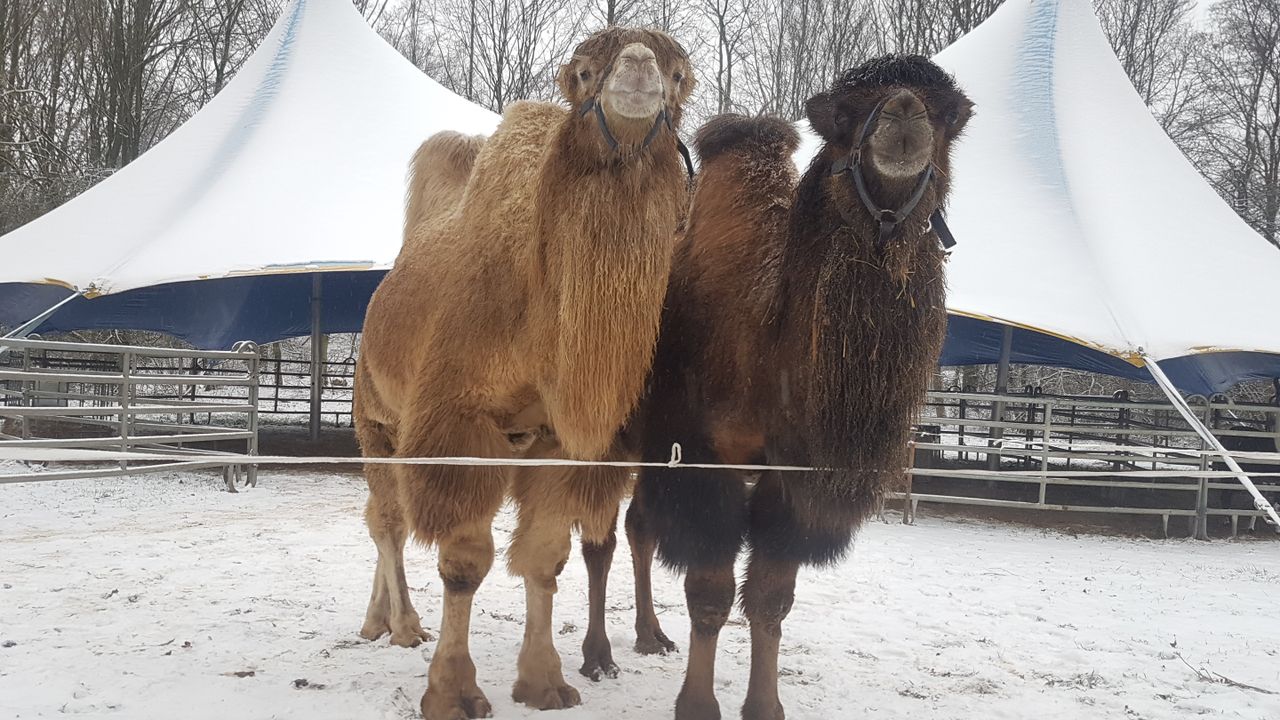 De kamelen van het Winter Wonder Circus, dat momenteel in Tilburg zijn tenten heeft opgeslagen, genieten van de sneeuw. Door hun dikke vacht en oorsprong uit het koude Siberië, zijn ze prima bestand tegen deze weersomstandigheden.