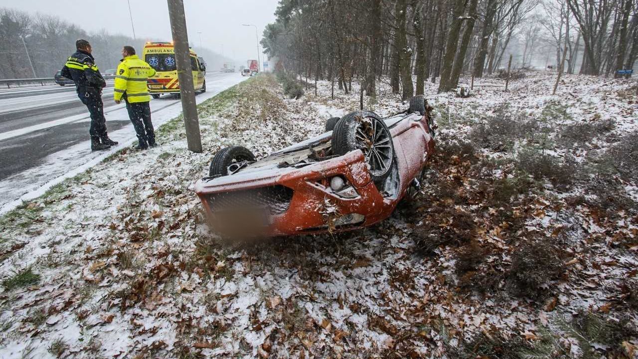Op de A50 bij Son en Breugel gleed een auto van de weg. De wagen bleef net voor het water in het gras hangen. De inzittenden kwamen met de schrik vrij. Ook in Oisterwijk en Dongen raakten auto's van de weg. Hier raakte niemand bij gewond.