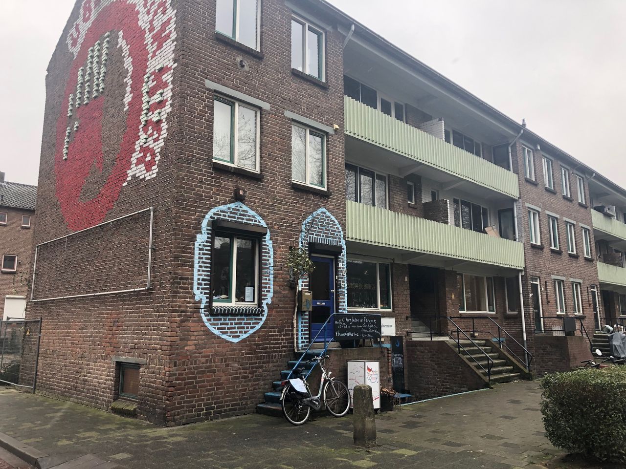 De buitenkant van de flat biedt een troosteloze aanblik. Maar binnen is de stemming nog steeds prima.
