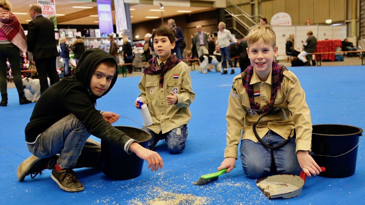 Je ruikt het en je ziet het: de honden moeten ook wel eens hun behoefte doen. En daar zijn de kinderen van Scouting Angelo Roncalli Eindhoven voor ingeschakeld. Ze lopen gewapend met handveger en blik door de zaal om ieder uitwerpsel zo snel mogelijk op te vegen. "Hiermee sparen we voor ons zomerkamp", vertelt een van de jongens. "Het is niet altijd even leuk maar we krijgen er wel geld voor."