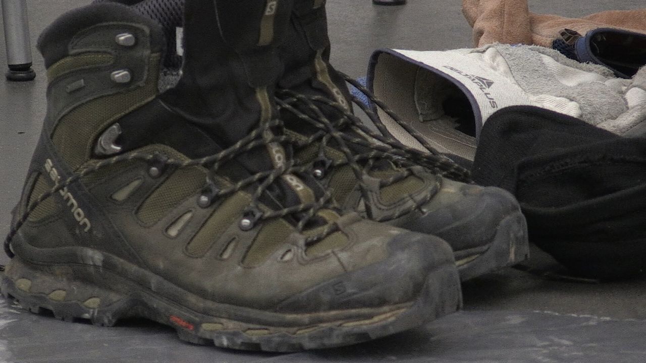Long had afgelopen week een klaptafeltje in het museum neergezet. Er lag gereedschap op, naast een thermoskan en wat bekers. Tegen een van de tafelpoten leunde een klein stilleven: twee 'zeer ervaren' wandelschoenen.