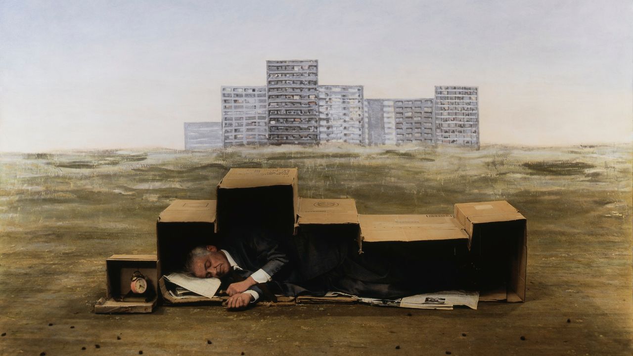 Een man staat met een stoffer en blik in zijn handen naar de neerdwarrelende sneeuw te kijken. Het is een echte Hocks-antiheld. Hij is iets van plan en Hocks legt hem vast nét op het moment dat tot hem doordringt dat zijn plan niet gaat werken.