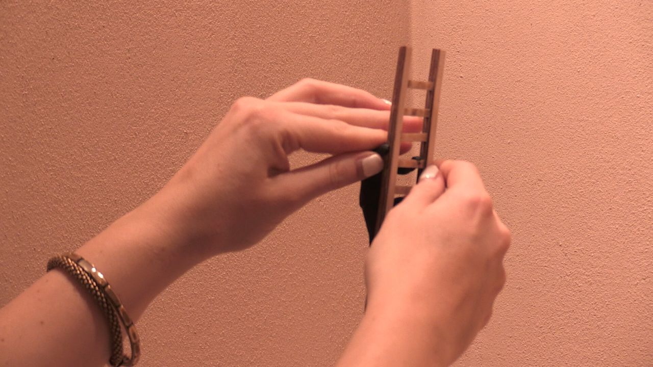 Aan de muur hangt één kunstwerk. Een tekening van figuren die op lange ladders balanceren. In een nisje staat een maquette van de tekening, bedoeld om te betasten, om te vóelen hoe het kunstwerk er uitziet.