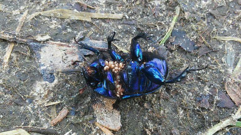 Tot haar verbazing zag Thea toen het diertje op de rug viel heel veel kleine beestjes zitten. Dit is duidelijk op de tweede foto te zien. Volgens mij zijn dit mijten, die de bosmestkever als transportmiddel gebruiken naar een volgende mesthoop. Mijten zijn eigenlijk parasieten, die als het ware samenleven met de mestkever. Ze doen de mestkever dus niets, maar 'rijden' als het ware mee. Eenmaal bij een mesthoop aangekomen, laten ze los en parasiteren ze andere dieren, die op de mesthoop afkomen.