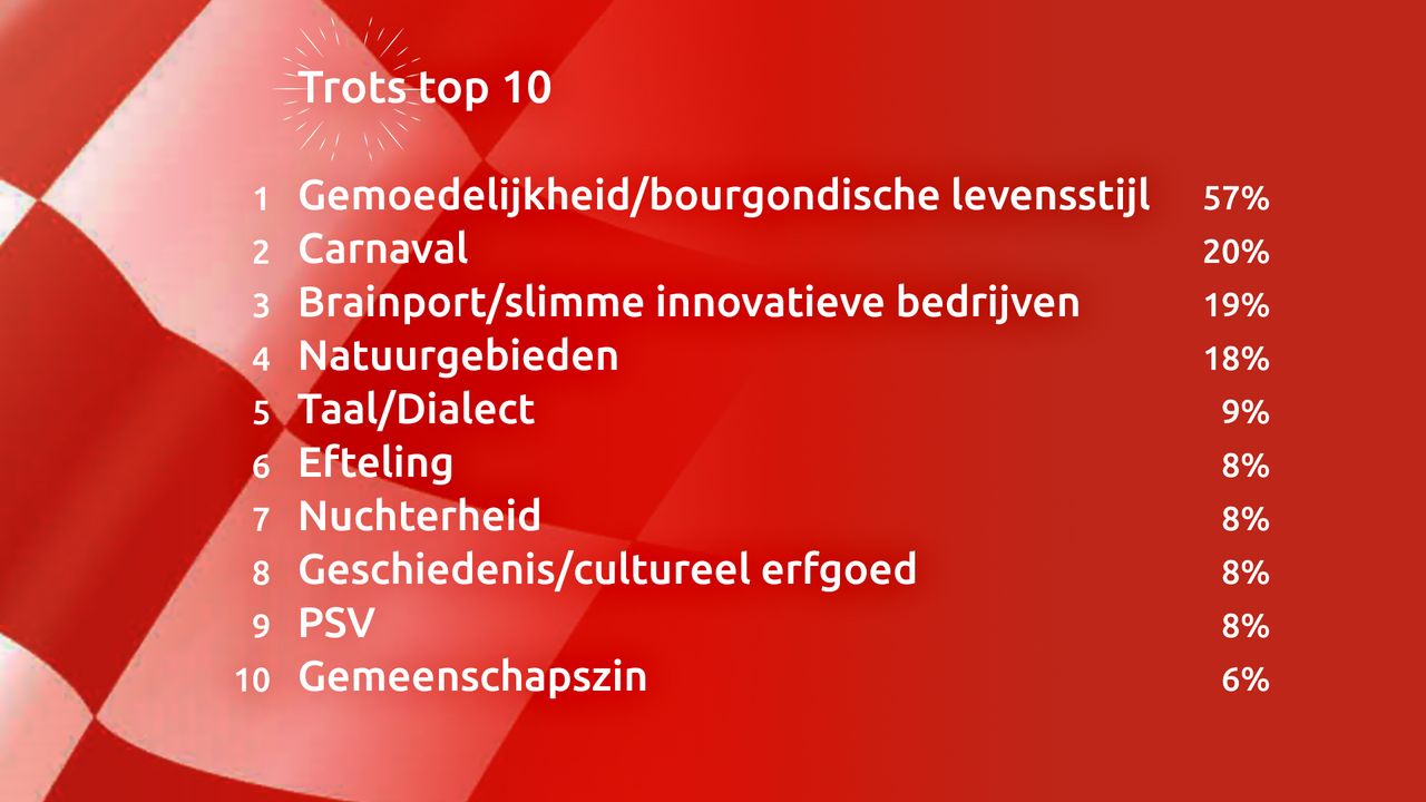 Dat blijkt uit onderzoek van I&O Research in opdracht van de NOS en de regionale omroepen. Het bureau onderzocht het provinciegevoel en met name waar – in ons geval – de Brabander trots op is of zich voor schaamt.