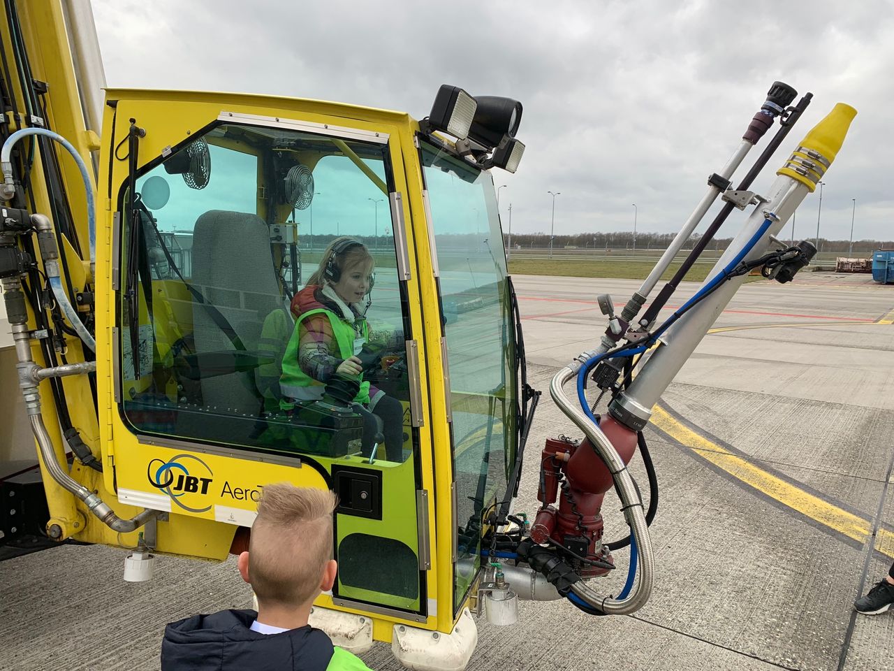De scholieren mochten ook in de TaxiBot, een karretje om vliegtuigen te slepen. "Ik zit liever in dit karretje dan op school! Ik heb geen zin om heel de dag stil te zitten", vertelt Kyra Sijm uit Boxtel. "Ze mogen wel tien keer per jaar staken." Later stond een interview met directeur Joost Meijs en een rondleiding bij de luchtmacht op het programma.