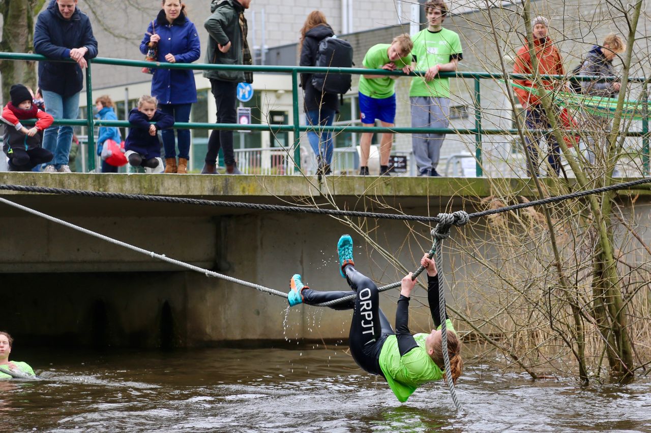 Halverwege de tocht stappen deelnemers de rivier de Dommel in om een stukje te zwemmen en als een aap hangend aan een touw enkele meters te klauteren. Klappertandend en blauwbekkend komen ze het water weer uit.