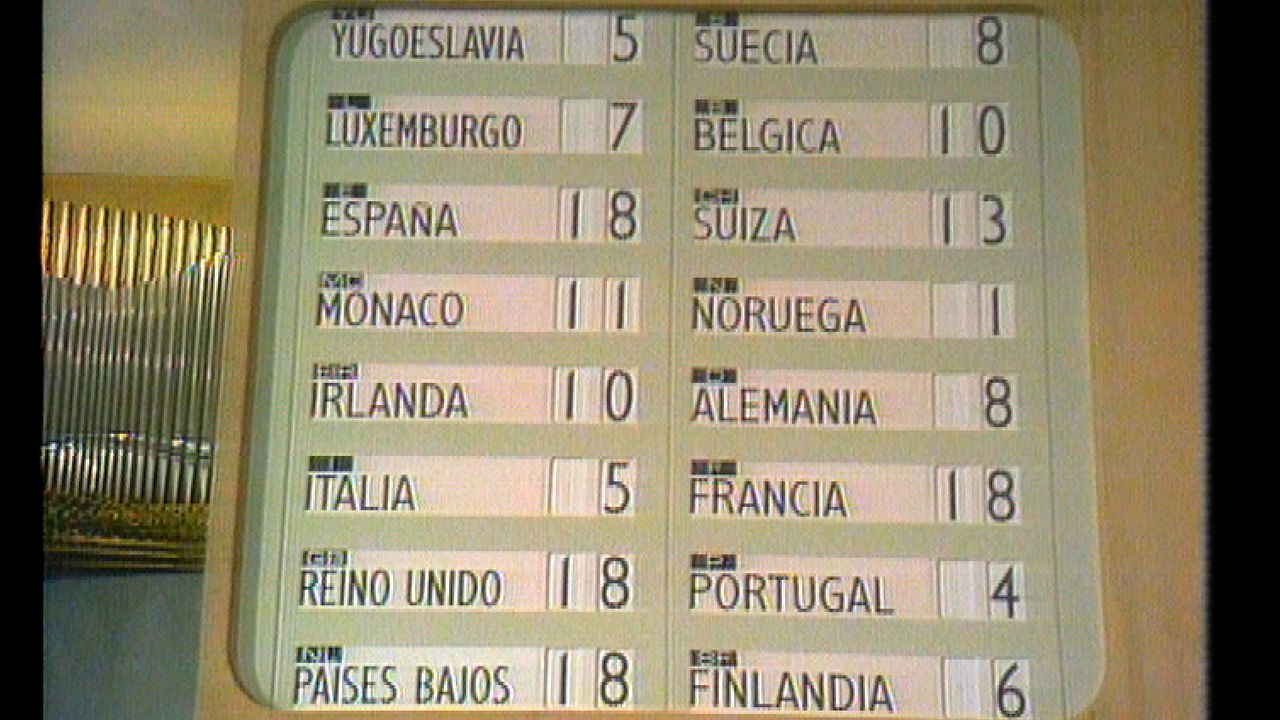 Een klein uur later, in datzelfde theater, is de verwarring compleet. Presentatrice Laurita Valenzuela grijpt vertwijfeld naar haar hoofd. Hoe moet dat nou? De stemmen zijn geteld en te zien is dat er vier landen zijn met de hoogste score. Frankrijk, Spanje, het Verenigd Koninkrijk én Nederland: allemaal hebben ze 18 punten. Wat nu?