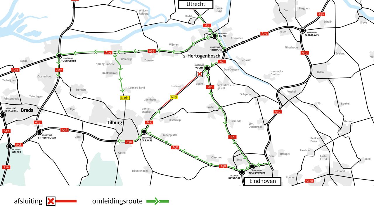 De N65 heeft een onderhoudsbeurtje nodig. Het gaat om het stuk tussen het knooppunt Vught en de kruising met Oisterwijk en Udenhout. Om de overlast zoveel mogelijk te beperken, gaat de weg alleen 's nachts dicht.