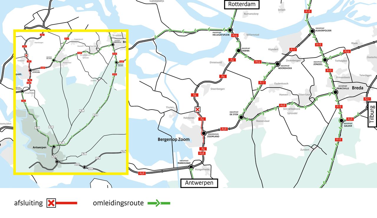 Rijkswaterstaat gaat ook klussen op de A4. Daardoor is deze snelweg tussen oprit (26) Halsteren en afrit (29) Bergen op Zoom-Zuid in de richting van Vlissingen en België afgesloten. De verbindingsweg A4-A58 ter hoogte van knooppunt Zoomland richting Roosendaal is ook dicht.