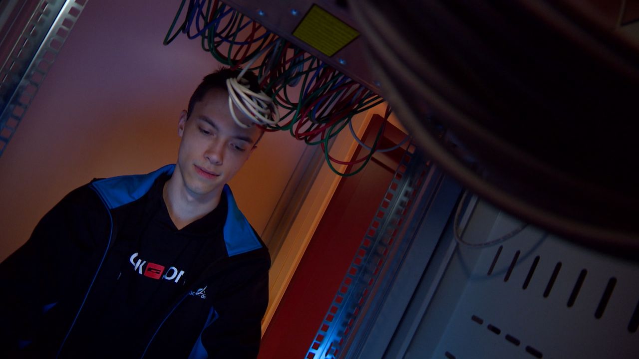 Enrico neemt ons mee naar de tweede verdieping. Daar staan nog meer switches in een rek. Hij sluit zijn laptop erop aan en binnen de kortste keren vliegen er allerlei codes voorbij.