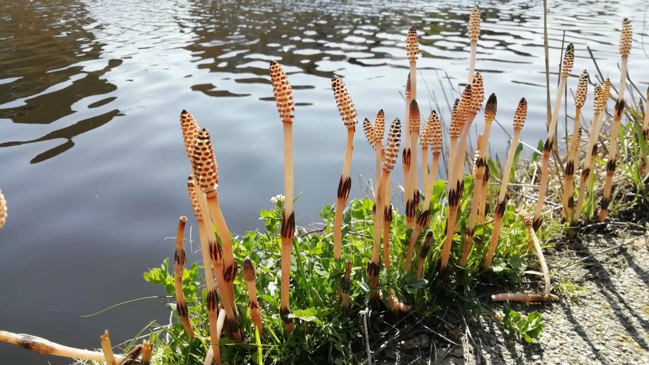 Op de werkelijk prachtige foto van Gerda van Dongen staat een stel bruine stengels met aan de kop een soort langwerpig mutsje met bruine stippen. We hebben hier te maken met de vruchtbare spruiten van heermoes ofwel akkerpaardenstaart. De heermoes behoort tot de paardenstaartenfamilie. Dit zijn allemaal sporenplanten. Ze hebben dus sporen om zich voort te planten en geen zaden. Dit is een overblijvende sporenplant met een enorm groot stelsel van ondergrondse wortelstokken. Je ziet deze sporenplant dan ook heel vaak op akkers, in bermen en ook in de tuinen. In het vroege voorjaar, meestal direct na de bloei van speenkruid, komen de geelbruine vruchtbare spruiten tevoorschijn. Je ziet meteen dat deze spruiten geen chlorophyl hebben. Ze kunnen dus geen voedsel maken met het zonlicht. Aan de bovenkant van de vruchtbare spruiten zit dus een soort mutsje, de sporenaar. In die sporenaar zitten zeshoekige schildjes en daar hangen de sporendoosjes aan. Uit die sporendoosjes komen de sporen. Tik maar eens zachtjes tegen die sporenaar aan, dan zie je de sporen wegstuiven. Pas later komen de geribbelde groene stengels - de spruiten - uit de grond naar boven. Die kunnen maximaal tachtig centimeter hoog worden. Mocht je in je tuin veel last hebben van heermoes, kijk dan eens op internet. Daar vind je mooie gerechten die te maken zijn met deze sporenplant.