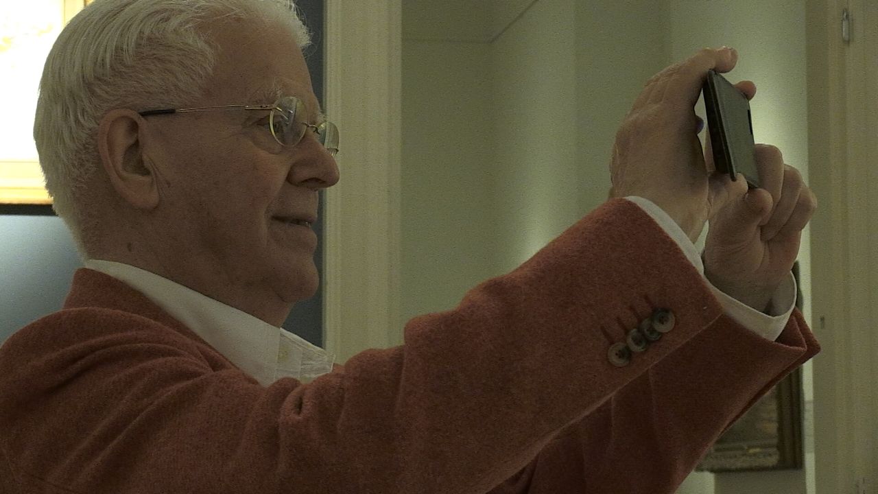 Frank maakt met zijn mobieltje foto's van de expositie. Gudule staat aan de andere kant van de zaal even te kletsen. Het is een momentje van rust. De tentoonstelling is ingericht en klaar, de officiële opening moet nog komen. De twee verzamelaars hebben even tijd om te genieten van het idee dat hún schilderijen nu in een echt museum hangen.