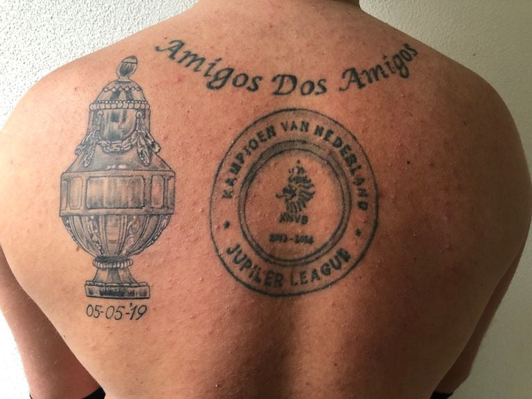 Trots trekt Wesley zijn shirt uit. Op zijn rug prijkt een enorme tatoeage van de beker, met daarbij de datum waarop de wedstrijd gespeeld wordt, 5 mei. "We maken dit als Willem II-fans niet vaak mee, vandaar."