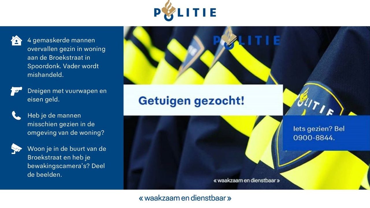 Vier mannen met bivakmutsen zijn dinsdagnacht iets na drie uur een huis aan de Broekstraat in Spoordonk binnengedrongen. De bewoners, een gezin bestaande uit vader, moeder en twee tieners, werden in hun slaap verrast. De vader werd door de overvallers mishandeld. Hij werd geschopt en geslagen en liep een hersenschudding en kneuzingen in zijn gezicht op. Zijn vrouw en kinderen raakten niet gewond.