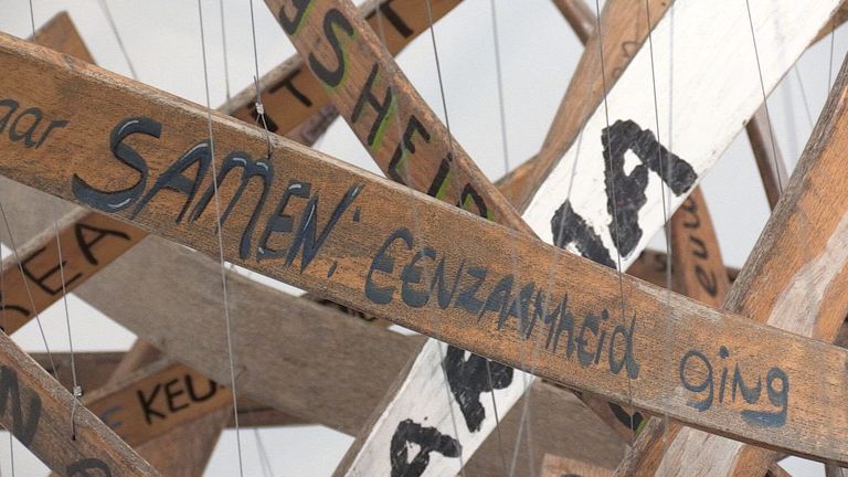 Het begint met een paar planken onder in de toren. Het is het begin van een lijn die uitkomt bij een grote tol die uit samenklonterend hout lijkt te bestaan en die daarna uitdunt in de richting van het dak.