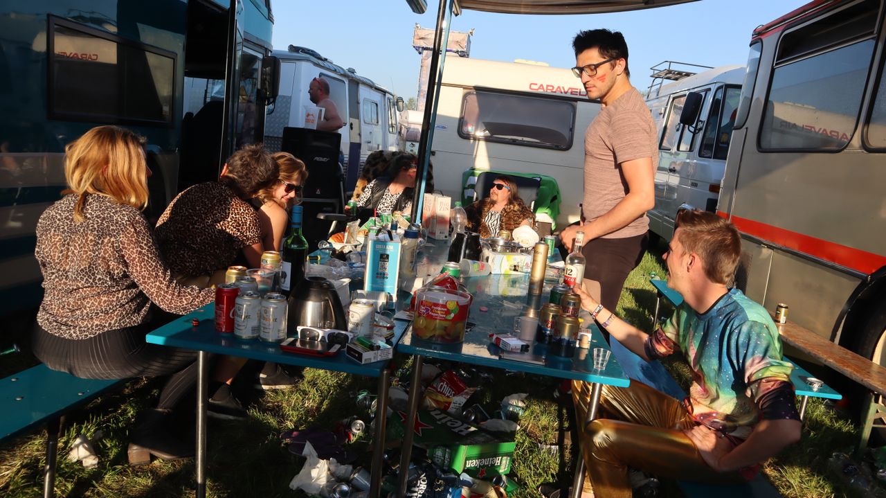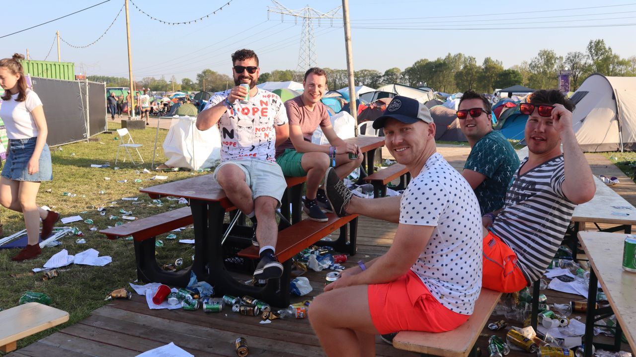 Een groep mannen zit in het zonnetje te genieten van een biertje. Overal om hen heen ligt afval. Een van de jongens vertelt: "Alles wat op het festival niet kan, dat kan hier op de camping wel. Hier gebeuren de leukste dingen."