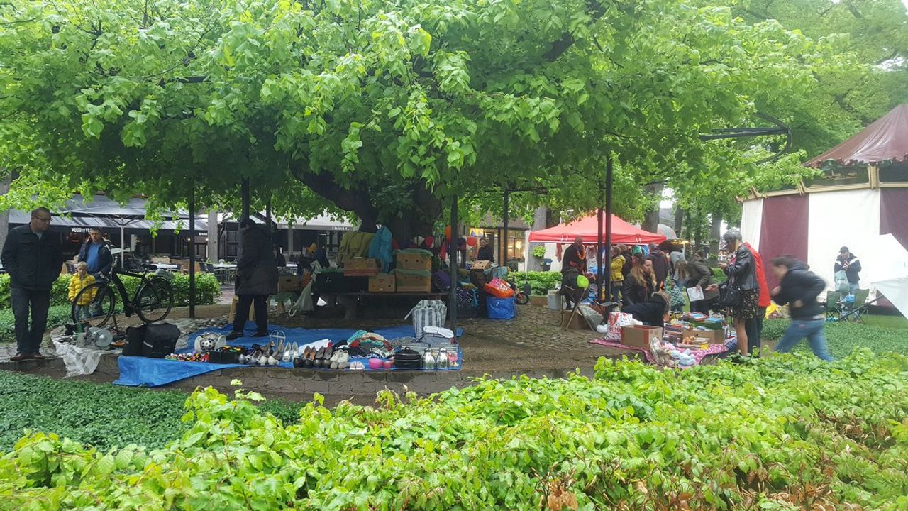 In alle vroegte werden de kleedjes uitgerold en de verkoopwaar vakkundig uitgestald. Een wolkbreuk zorgde echter voor een dipje in het goede humeur: verkopers bleven achter met hun natte spullen. Halsoverkop werden de aangeboden items afgedekt.