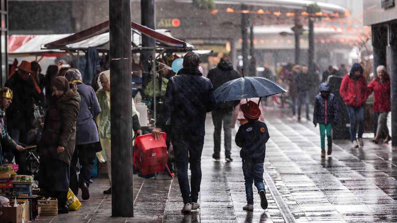 Koningsdag druilerig van start: schuilend onder paraplu over de vrijmarkt