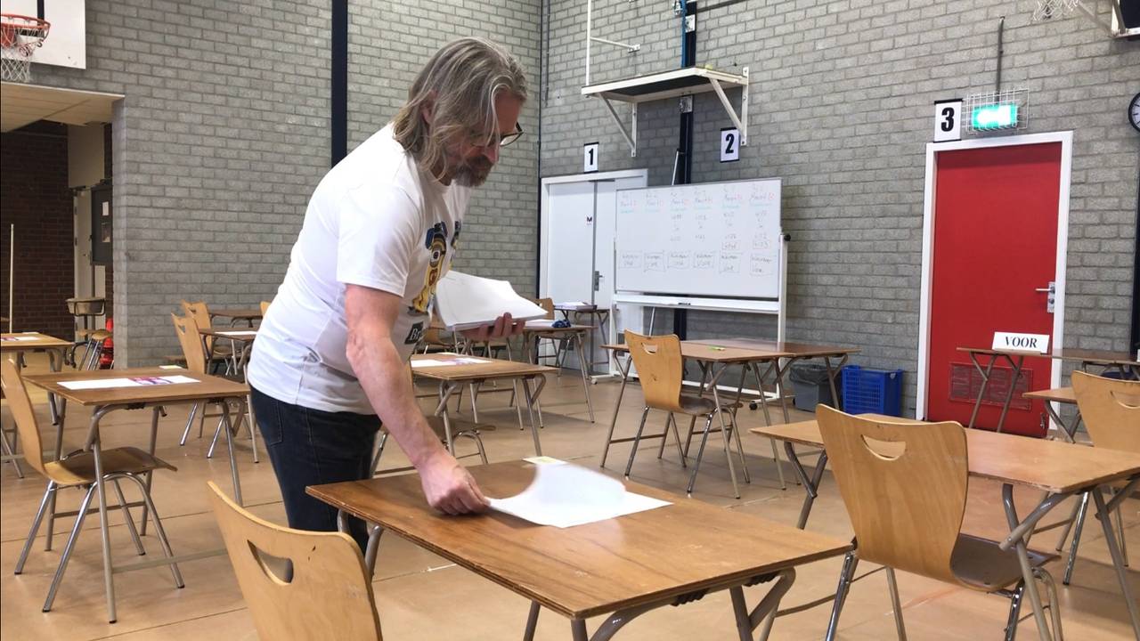 Daarna gaat hij naar gymzaal 3, waar hij de nummerkaartjes op de hoeken van de tafeltjes legt. Daar heeft van den Boogaart soms best nog een flinke klus aan. "Eventjes puzzelen waar ze het beste kunnen zitten." Er zijn namelijk leerlingen die een laptop mogen gebruiken, een speciale stoel nodig hebben of een kaartje krijgen voor extra tijd. In die zaal buigen de leerlingen zich 's middags over het examens Nederlands en Management& Organisatie. Louis deelt voor de zekerheid dus maar een extra antwoordvellen en kladpapier uit.