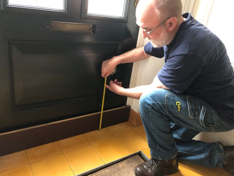 Met een cirkelzaag maakt Fons van Extel een schot van een plank en rubbers. Hij hoopt dat hij hiermee bij de volgende hoosbui het water aan de deur tegen kan houden.