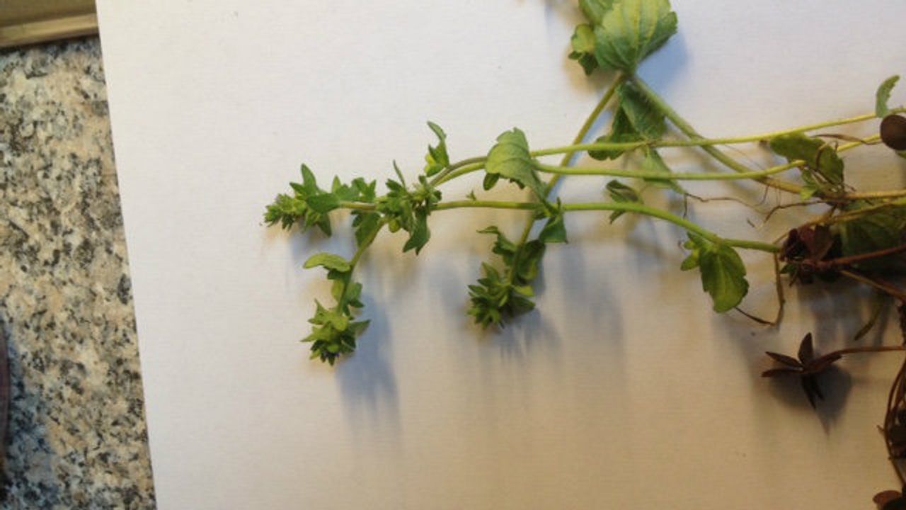 Op de foto die Ria Koenraadt me stuurde, zie een klein plantje liggen met donkerrode blaadjes. We hebben hier te maken met een invasieve soort, namelijk gehoornde klaverzuring. De gehoornde klaverzuring is een vrij kleine plant met kruipende bladeren. In het begin zijn deze bladeren groen, maar ze kleuren vaak bruin tot paars uit. De oorspronkelijk groeiplaats van de plant is onduidelijk, maar onderzoekers denken dat deze plant oorspronkelijk uit Noord-Amerika komt. De blaadjes van de gehoornde klaverzuring zijn eetbaar, maar hebben een wat wrange smaak. Als je op internet kijkt, kun je zien dat je er van alles mee kan doen. Je kunt er bijvoorbeeld kruidenthee van trekken. Sinds het eind van 2017 is er een gestage uitbreiding van gehoornde klaverzuring te zien in stedelijk gebied. De plant groeit daar vaak op zonnige plaatsen in zandige kieren bij muren en tussen plaveisel.