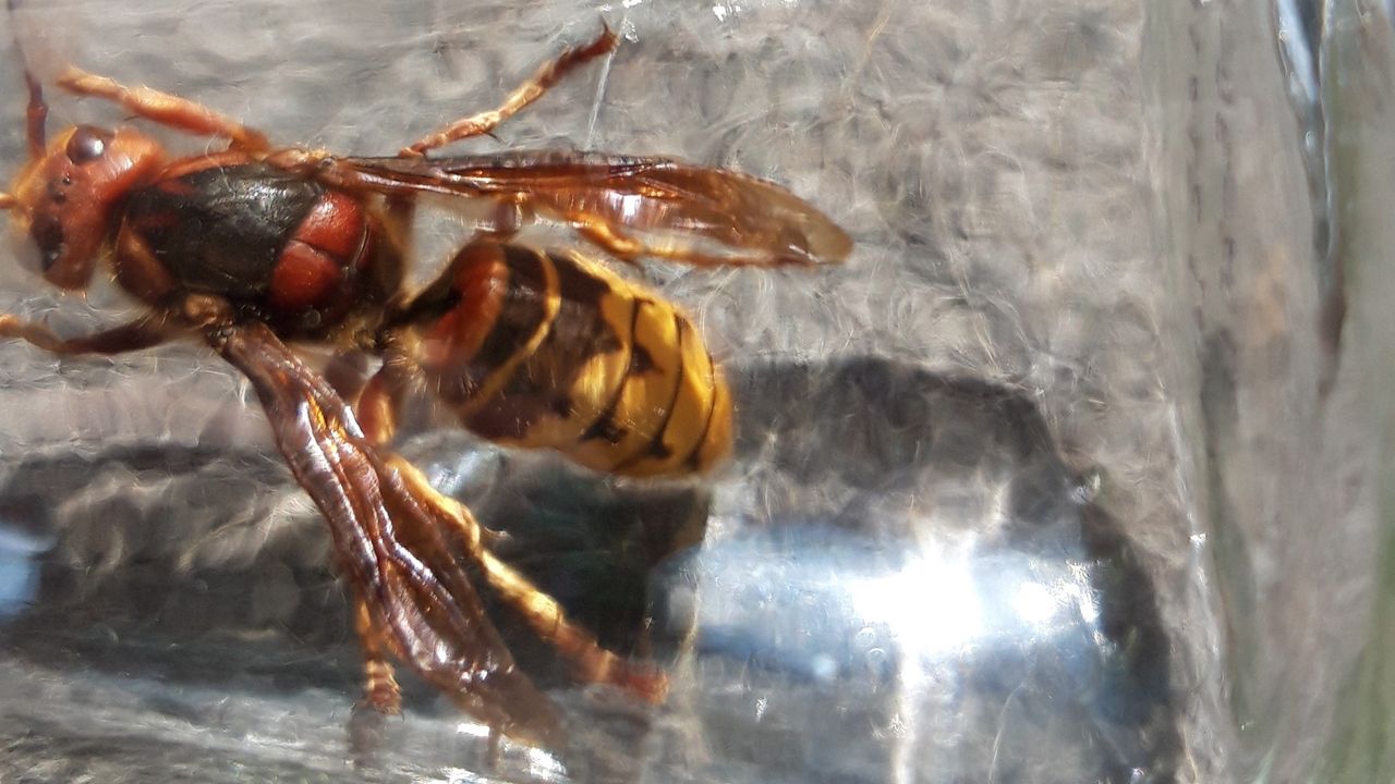 Op de foto die ik kreeg van Mientje Brouwers zie je een grote wesp met een geel en zwart lichaam, een gele kop met wat rood en een rood borststuk. We hebben hier te maken met de Europese hoornaar, niet een Aziatische hoornaar. De Aziatische hoornaar heeft bij het borststuk en de kop geen rood, maar veel zwart. Europese hoornaars behoren tot de familie van de echte wespen, ook wel papierwespen genaamd. Europese hoornaars kunnen gemakkelijk 3,5 centimeter lang worden, Aziatische hoornaars tussen de 3,5 en vier centimeter. In het algemeen zijn hoornaars niet agressief maar als ze zich moeten verdedigen, steken ze. Zo’n steek is pijnlijk, maar het gif is minder krachtig dan dat van een honingbij. Om hun larven te voeden, gebruiken ze dit gif om insecten te doden. Na de doodsteek vermalen ze het insect tot een papje. Dit papje geven ze dan aan de larven, die vervolgens het volwassen dier een zoete vloeistof geven. Met deze vloeistof krijgen die weer energie om te kunnen vliegen, maar ook om nog meer insecten te vangen.