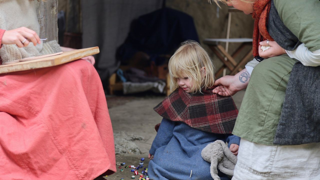 Een eindje verderop in het bos zijn de Vikingen met hun kampen neergestreken. Er hangt een heel relaxt sfeertje. Gezinnen die rondom een vuurtje zitten te fröbelen. De een is bezig met houtsnijwerk terwijl de ander met naald en draad een leren tas maakt. Koters huppelen vrolijk rond en vermaken zich met zand, takken en de bomen om zich heen. Voor deze Vikingen staat de tijd stil.