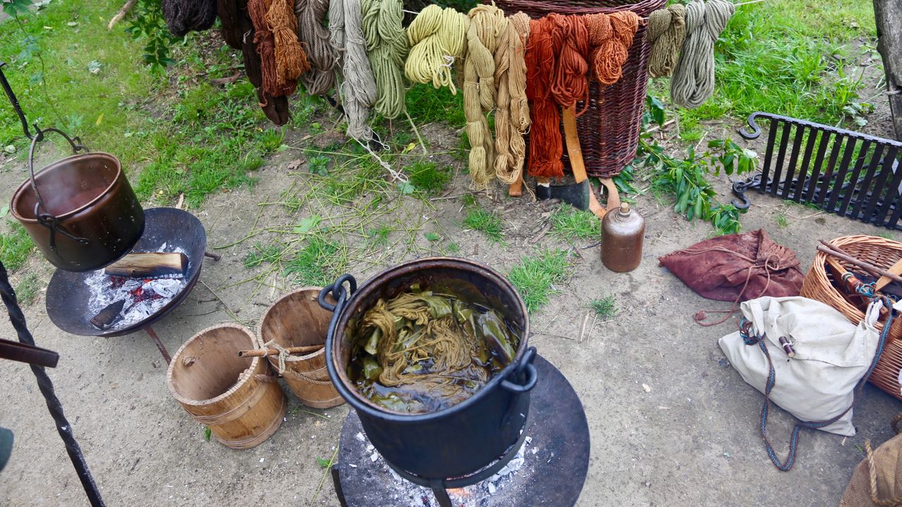 Dat geldt ook voor Karin Rademakers uit Echt, ze is al tien jaar vrijwilligster bij het PreHistorisch Dorp. Ze zit naast een paar pannen die boven een vuur hangen en zijn gevuld met water, bladeren van een notenboom en met wol. “De bladeren en het water verkleuren naarmate ze langer in de pan liggen, eerst worden ze lichtgeel, dan groen en vervolgens bruin. Je haalt de wol eruit zodra het de gewenste kleur heeft gekregen. Zo kun je met heel veel soorten planten wol verven.”