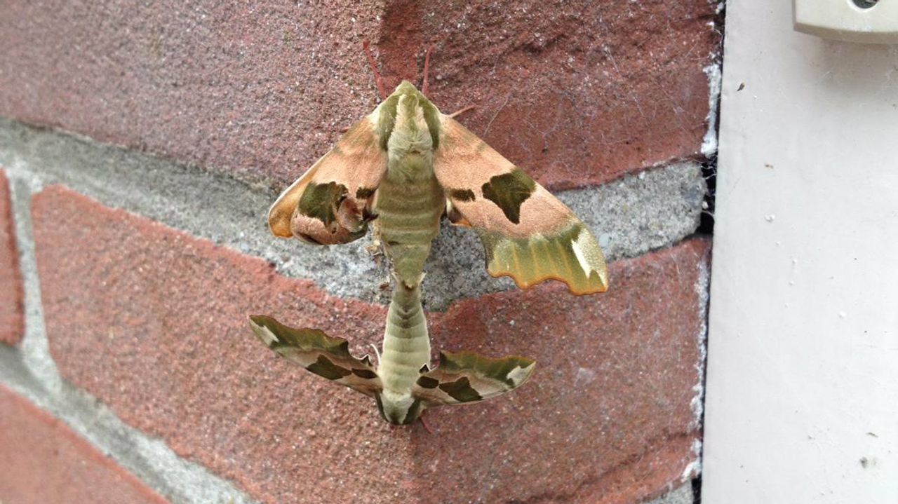 Op de foto die ik kreeg van Leo van Gils staat iets heel bijzonders. Leo heeft twee parende lindepijlstaarten gefotografeerd. Deze prachtige nachtvlinders hebben aan de onderkant een duidelijke groenige band. Verder zie je ook roze en donkere vlekken. De bovenste lindepijlstaart is een vrouwtje, want die zijn wat meer oranjeroze getint. De onderste lindepijlstaart - het mannetje - is meer groenig van kleur. Soms zijn de twee grote donkere olijfgroene of bruine vlekken midden op de voorvleugel van de lindepijlstaarten zo groot dat ze een band vormen, maar meestal zijn ze sterk gereduceerd tot slechts vlek. Lindepijlstaarten zijn nachtvlinders uit de familie van de pijlstaarten en hun vleugels kunnen een spanwijdte hebben van maximaal tachtig millimeter. Het zijn echte nachtvlinders, die van half april ten met eind juli vroeg in de nacht vliegen. Als er dan een lamp aan is, komen ze daar op af. Overdag rusten de lindepijlstaarten op boomstammen, in de kruin van lindenbomen of op muren. Op de muur van Leo van Gils hebben deze twee lovers elkaar gevonden. Hoe mooi is dat!